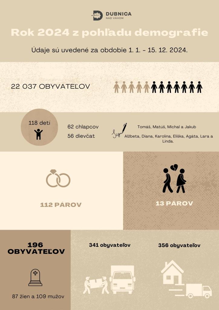 Hoci trend mierneho poklesu počtu obyvateľstva Dubnici nad Váhom neobišiel ani tento rok, stále zostáva živým miestom s bohatým rodinným životom s 22 037 obyvateľmi. V tomto roku nás tiež navždy opustilo 196 spoluobčanov, čo je o 38 viac ako minulý rok.