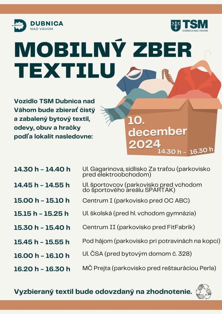 Zimný termín mobilného zberu textilu prebehne v utorok 10. decembra na ôsmich rôznych lokalitách v meste. Pracovníci TSM Dubnica nad Váhom budú zbierať čistý a zabalený bytový textil, odevy, obuv a hračky podľa nasledovného harmonogramu: