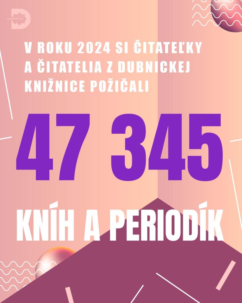 V roku 2024 si čitateľky a čitatelia z dubnickej knižnice dočasne domov odniesli 47 345 kníh a periodík. V priemere to vychádza na obdivuhodných 34 kníh na jedného čitateľa. Viac ako 430 čitateľov knižnice tvoria detskí návštevníci, teda školáčky a školáci do 15 rokov. Dominantnú skupinu – až 69 percent, tvorí nežnejšie pohlavie.