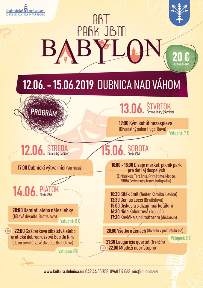 Grottu s vyhliadkovou vežou dnes už Dubničanom ani nenapadne označiť iným menom. V minulosti bol však v Dubnici zaužívaný historický názov Babylon. A presne také pomenovanie dostal nový koncept kultúrneho podujatia, ktoré si už v júni pre obyvateľov mesta pripravilo oddelenie kultúry. „Názov Babylon sme pre toto multižánrové podujatie vybrali preto, lebo chceme uchovať názov Grotty s vyhliadkovou vežou tak, ako sme si ho pamätali z mladosti. Táto stavba je charakteristická pre architektúru parkov, a teda vyššiu kultúru, ktorú prinášame. Samotná idea Babylonu biblického mesta symbolizuje spleť kultúr, v našom prípade to bude rôznorodosť žánrov umenia,“ priblížil myšlienku vedúci kultúry Richard Benech. Ako dodal, podtitul podujatia PARK ART JBM možno voľne preložiť ako umenie v Parku Jána Baltazára Magina.