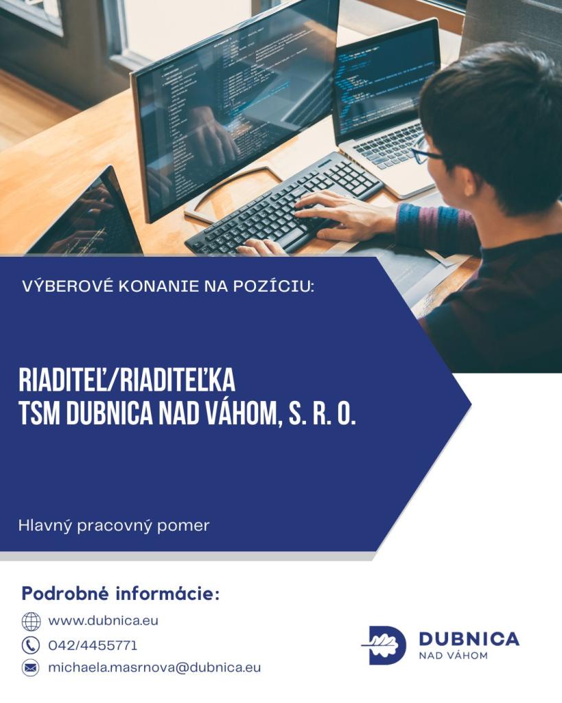 - Obálku označte „Výberové konanie – riaditeľ/riaditeľka TSM Dubnica nad Váhom, s. r. o. – NEOTVÁRAŤ“.