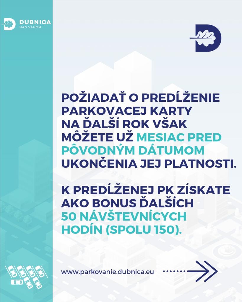 Dobrou správou je, že parkovaciu kartu si môžu obyvatelia predĺžiť už mesiac pred pôvodným skončením jej platnosti. Navyše, tí, ktorí tak urobia v predstihu, získajú bonus v podobe 50 návštevníckych hodín navyše – teda spolu až 150 hodín.