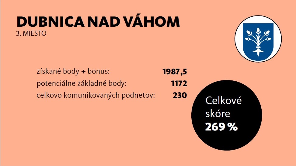 Dubnica nad Váhom sa za rok 2019 umiestnila v trojici najlepších slovenských miest v kategórii komunikácia. Konkrétne 3. miesto za komunikáciu s obyvateľmi si mesto zaslúžilo celkovým skóre 269 %. Hodnotila sa napríklad úplnosť komunikácie i jej rýchlosť. Dubnica nad Váhom v uplynulom roku komunikovala presne 230 podnetov. „Komunikáciu s občanmi, väčšiu transparentnosť a efektivitu pri riešení podnetov sme si určili ako jednu z priorít. Som rád, že sme súčasťou tohto projektu len prvý rok a už sa nám podarilo umiestniť v rebríčku medzi tými najlepšími. Verím, že sa budeme ešte viac a viac zlepšovať v prospech všetkých Dubničanov. Zároveň mám radosť, že obyvatelia túto možnosť naozaj využívajú a komunikujú s nami aj týmto spôsobom,“ zhodnotil dubnický primátor Peter Wolf, ktorý si ocenenie v hlavnom meste prevzal spolu s Milanom Dohnanským, ktorý má na Mestskom úrade v Dubnici nad Váhom na starosti všetky organizačné činnosti súvisiace s platformou Odkazprestarostu.sk. V skupine miest nad 20-tisíc obyvateľov sa v kategórii riešenie podnetov Dubnica nad Váhom umiestnila na 15. mieste z celkového počtu 44 hodnotených samospráv.