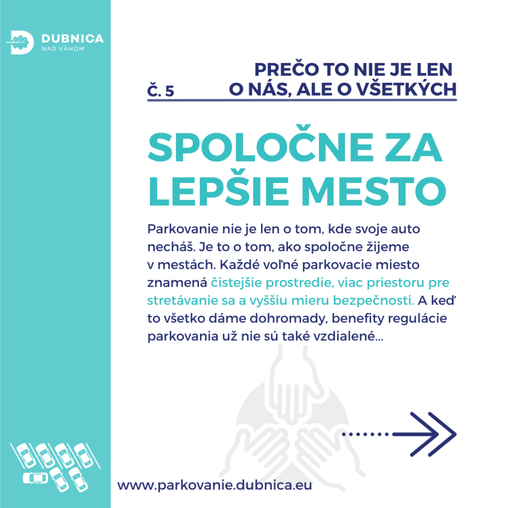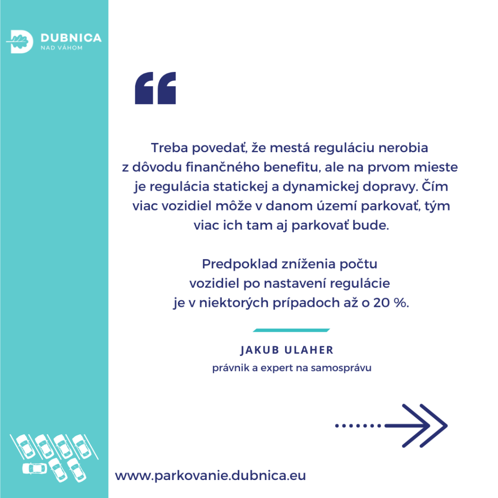 V našom meste parkuje denno-denne viac ako 15-tis. vozidiel. Nie je možné, aby každé z nich malo svoje parkovacie miesto. Úlohou regulácie statickej dopravy nie je zabezpečovať miesta na parkovanie a budovať parkovacie kapacity donekonečna. Jej prioritným cieľom je spomaliť rast počtu automobilov v meste a vytlačiť vozidlá do okrajových častí mesta tak, aby centrum a sídliská zostali priechodné, a teda bezpečné. Cieľom mesta Dubnica nad Váhom je naplniť koeficient jedno parkovacie miesto na jednu bytovú jednotku v meste, ku ktorému sa samospráva dlhodobo približuje. V meste sú lokality, kde je tento koeficient už naplnený. Sú však aj také, kde nie, a práve tým sa vďaka regulácii statickej dopravy bude mesto môcť venovať a hľadať adekvátne riešenia. Bez regulácie, čiže bez presných pravidiel, nebolo možné zmonitorovať jednotlivé lokality a príslušnosť vozidiel k nim.