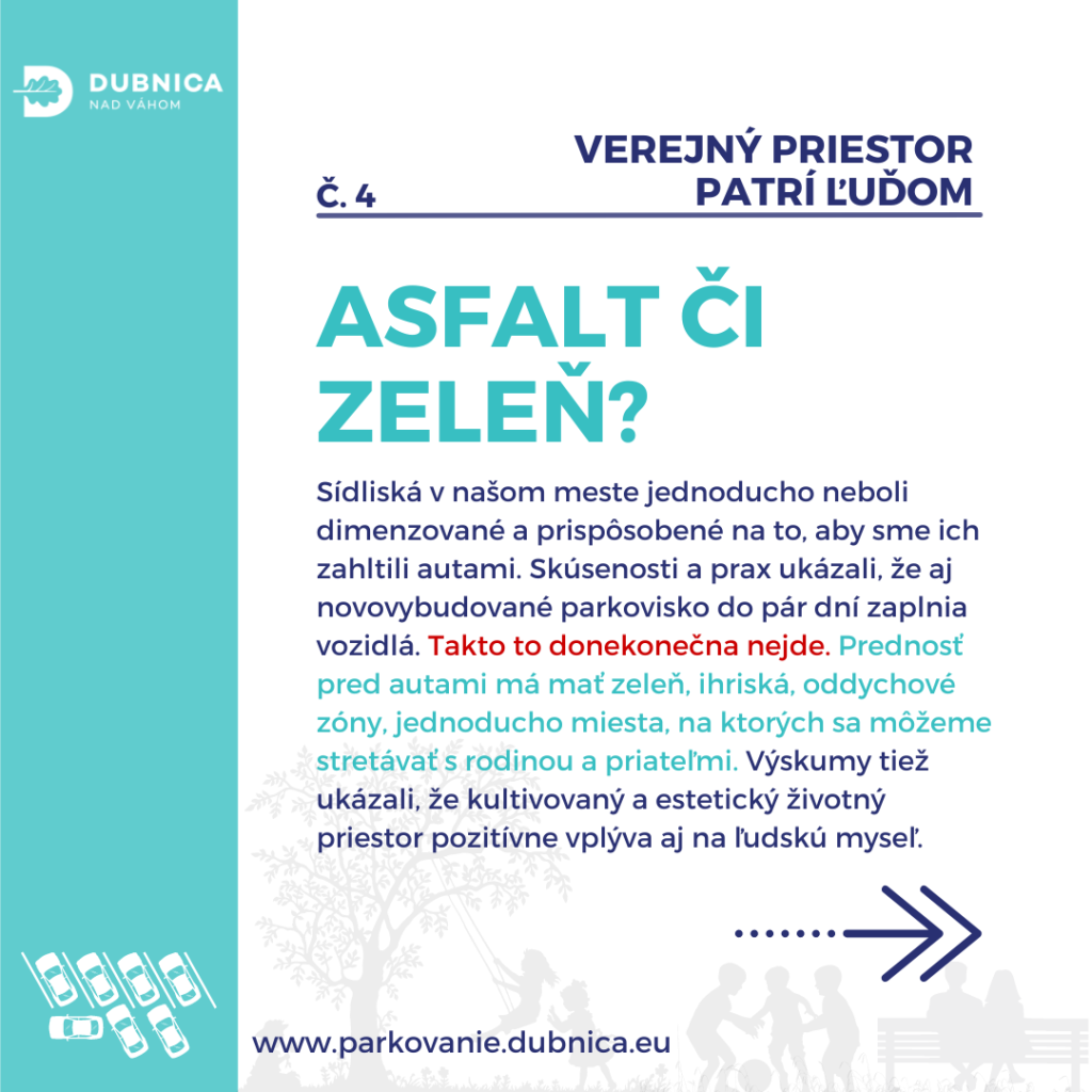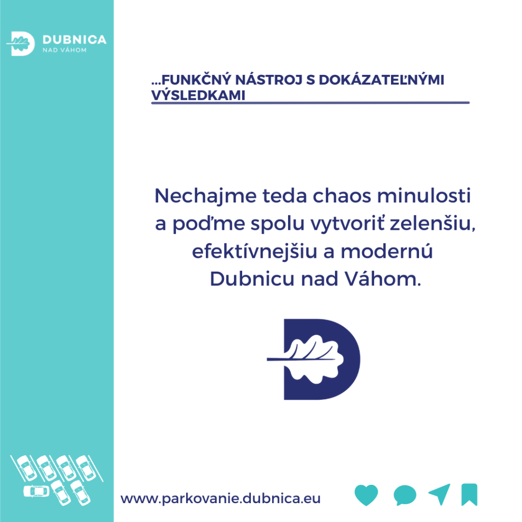 Mesto Dubnica nad Váhom sa na zavedenie regulácie statickej dopravy dobre pripravilo. Celý systém sa kreoval v úzkej spolupráci s ďalšími mestami, ktoré majú reguláciu dopravy zavedenú už dlhodobo a môžu sa teda pochváliť konkrétnymi výsledkami. Nezavádzali sme nič nové a čo je najpodstatnejšie, nezavádzali sme nič neoverené. Autá síce nemusia zmiznúť, ale presunú sa zo zelene, zo zákrut, z ciest, z križovatiek a z miest, kde tvoria prekážku pre peších či matky s kočiarikmi. Možno vždy nenájdete voľné parkovacie miesto v tesnej blízkosti vášho bytového domu, ale nájdete ho minimálne v blízkej a prijateľnej vzdialenosti. Za vašu bezpečnosť to istotne stojí.