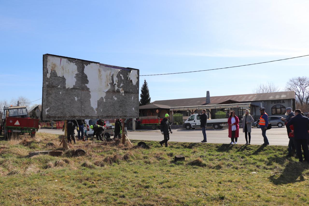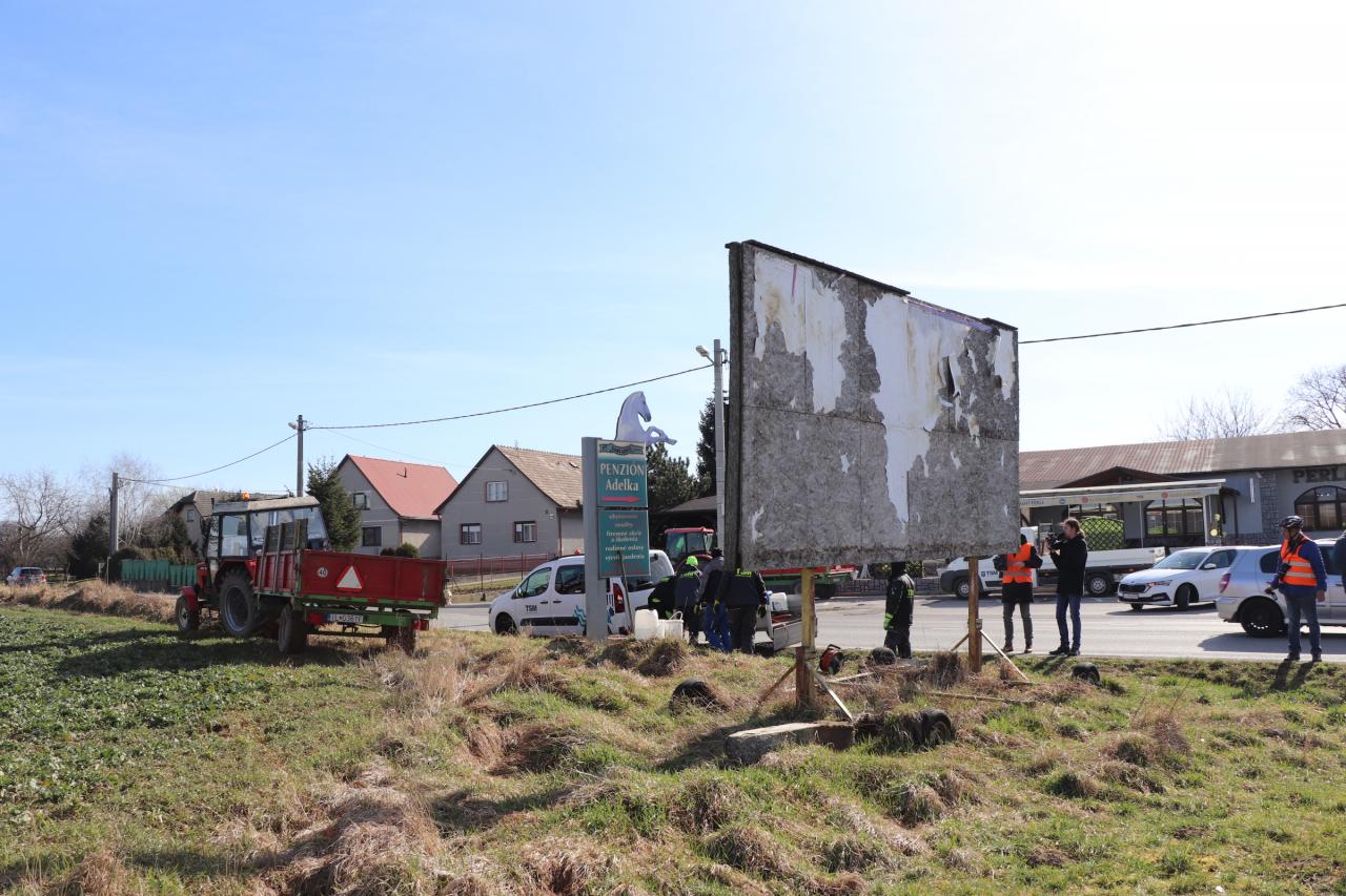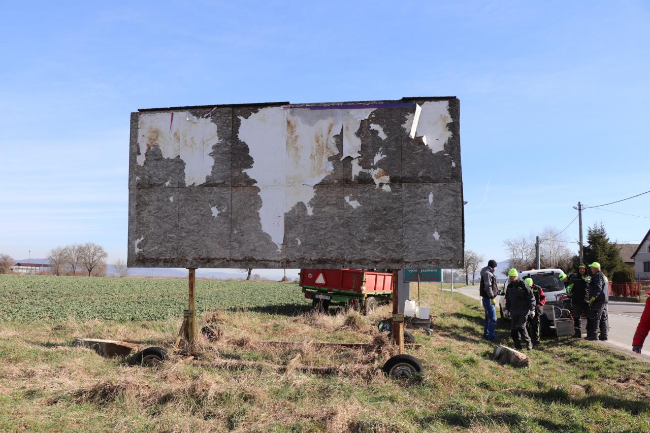 Mesto na vlastné náklady doposiaľ odstránilo takmer 30 nelegálnych reklamných pútačov. „Bilbordy odstraňujeme paličskou rezacou súpravou, prípadne uhlovou brúskou. Reklamný pútač následne rozoberieme a jeho jednotlivé časti zhodnotíme, prípadne zneškodníme,“ priblížia priebeh prác likvidácie nelegálnych pútačov riaditeľka TSM Vladimíra Klačanská. Ako dodala, práca na odstránení jedného reklamného pútača zamestná 5 mužov na minimálne trištvrte hodinu.