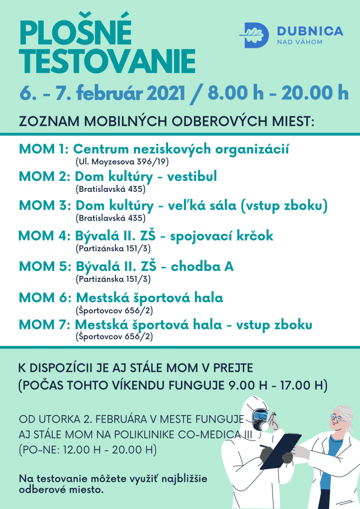 Na základe uvedeného poskytne mesto Dubnica nad Váhom občanom možnosť víkendového plošného testovania, ktoré sa uskutoční 6. a 7. februára 2021 na siedmich odberových miestach. Občania sa môžu prísť dať otestovať v sobotu a v nedeľu od 8.00 h do 20.00 h na ktorékoľvek odberové miesto, pričom na každom z odberových miest by mala byť zabezpečená web kamera monitorujúca aktuálnu vyťaženosť odberového miesta. „Objednávací systém počas tohto víkendu pre nedostatok časového priestoru fungovať nebude, obyvateľov prosíme, aby využili najbližšie odberové miesto a využívali možnosť dať sa otestovať aj v priebehu nedele,“ priblížila prednostka mestského úradu Silvia Kiačiková.