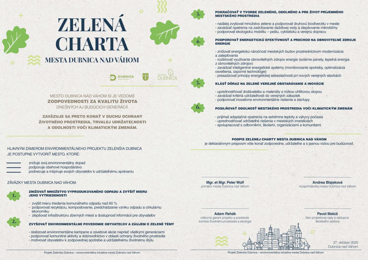 Záväzok konať udržateľne, flexibilne reagovať na klimatické zmeny v mestských podmienkach a zároveň zvyšovať environmentálne povedomie obyvateľov prostredníctvom konkrétnych aktivít samospráva deklaruje podpísaním Zelenej charty mesta Dubnica nad Váhom. Odborným garantom iniciatívy Zelenšia Dubnica nad je Adam Rehák, predseda Komisie životného prostredia a ekológie, ktorá pôsobí pri Mestskom zastupiteľstve v Dubnici nad Váhom. Realizáciu aktivít a napĺňanie cieľov projektu v školskom prostredí bude ako člen projektovej rady zastrešovať zástupca riaditeľky školy ZŠ s MŠ Centrum I Pavol Matúš.