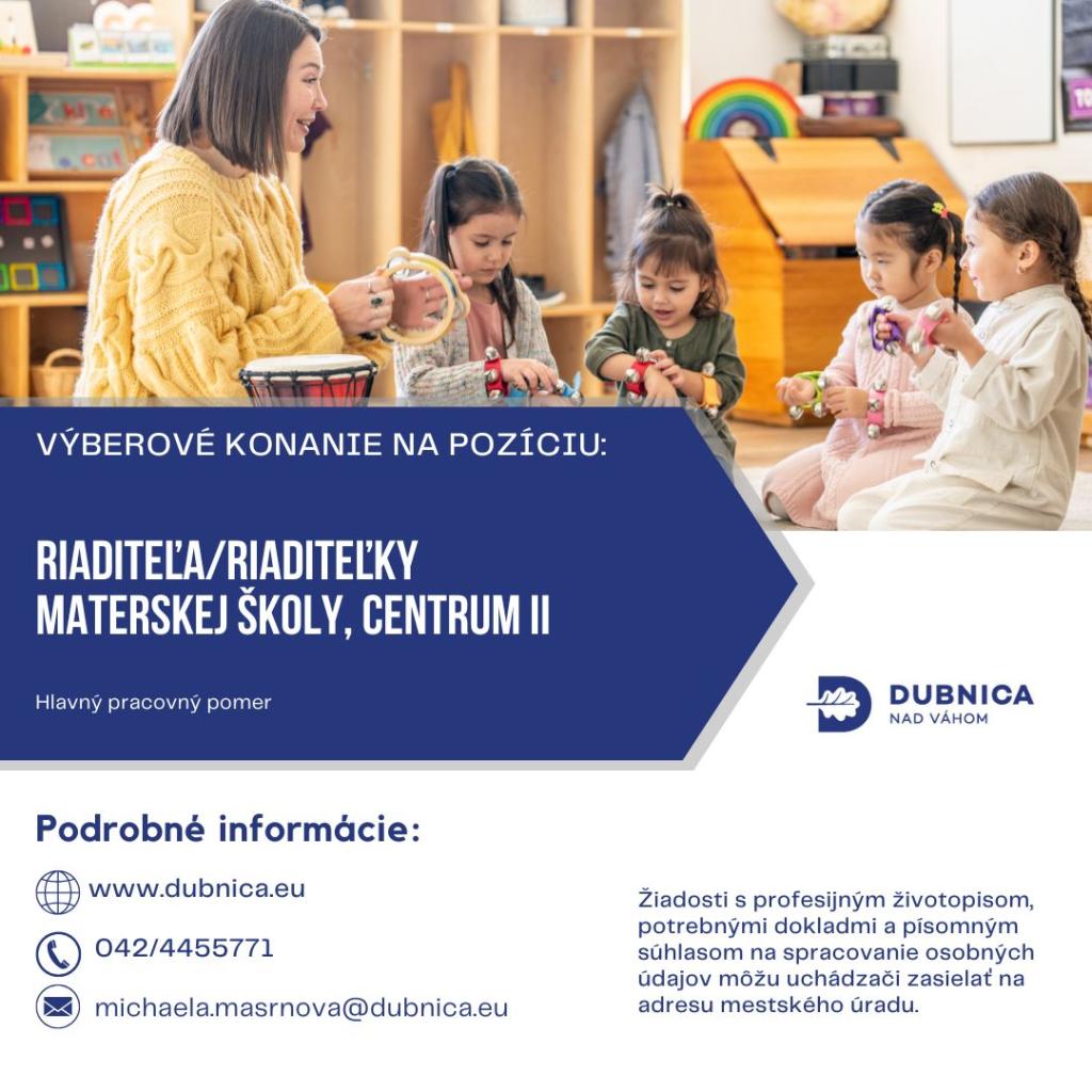 Druh pracovného pomeru: Hlavný pracovný pomer. Funkčné obdobie riaditeľa materskej školy je päťročné.