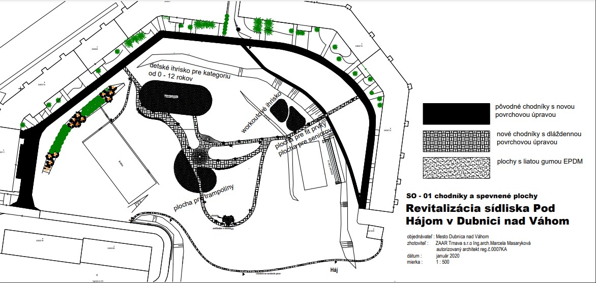 Sídlisko Pod hájom a jeho časť nazývaná Účko patrí k najväčším sídliskám v Dubnici nad Váhom. „Zabezpečíme tu totiž okrem detského ihriska aj workoutové ihrisko, prvky pre seniorov či multifunkčné ihrisko pre loptové športy. Ďalej kompletne zrevitalizujeme zelené plochy a vysadíme takmer 3 600 krov a ďalšie stromy, doplníme nové lavičky, odpadovú infraštruktúru, ako aj informačné tabule. Novinkou nielen na sídlisku, ale aj v meste bude malý amfiteáter či trampolíny,“ doplnila hlava mesta s tým, že priestor bude osvetlený vodotesnými svietidlami v dlažbe, lemujúcimi prístupové chodníky.