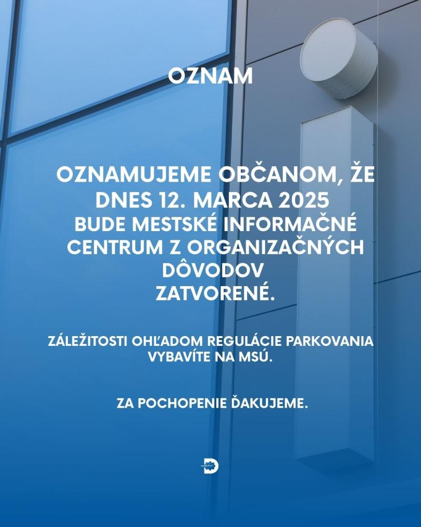 Oznamujeme občanom, že dnes 12. marca 2025 bude Mestské informačné centrum z organizačných dôvodov zatvorené.