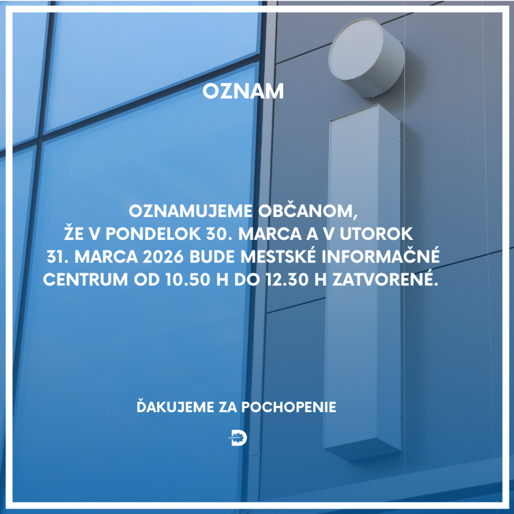 Mestské informačné centrum bude z prevádzkových dôvodov dnes a zajtra (pondelok, utorok) v čase od 10.50 h do 12.30 h zatvorené. Ďakujeme za pochopenie.