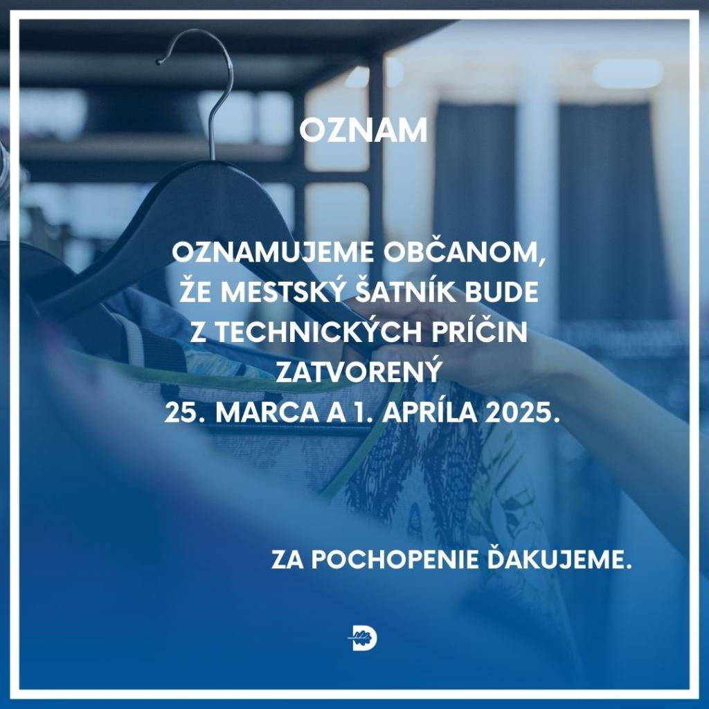 Oznamujeme občanom, že mestský šatník bude z technických príčin zatvorený 25. marca a 1. apríla 2025.