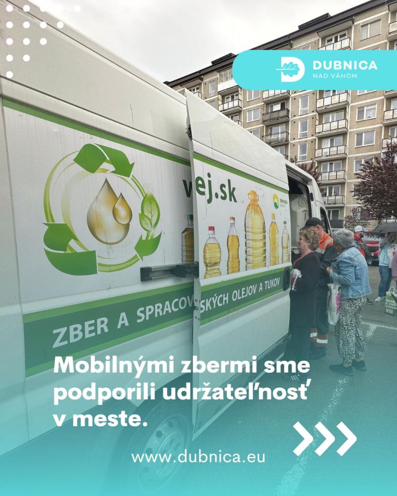 „Zamestnanci TSM Dubnica nad Váhom vyzbierali počas mobilného zberu textilu 160 kilogramov šatstva. Občania do mobilného zberu použitého oleja odovzdali 367 litrov použitého oleja, čo prestavuje 336 kilogramov,“ informovala vedúca surovinovo - odpadového hospodárstva Gabriela Záhorcová. Za každé 3 litre použitého kuchynského oleja ste si mohli odniesť 1 liter nového, prípadne za každý 1 liter použitého kuchynského oleja za 1 liter octu. Dohromady ste si odniesli 100 litrov nového oleja a 67 litrov octu.