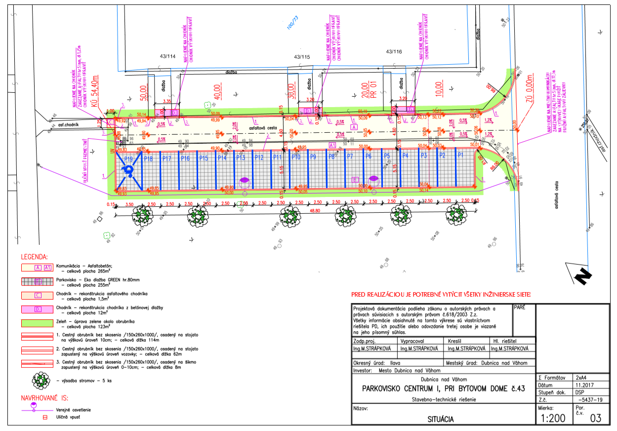 Nová parkovacia plocha pri bytovom dome číslo 43 bude dlhá takmer 49 metrov a poskytovať bude 19 parkovacích státí, z toho jedno státie pre osoby so zníženou schopnosťou pohybu. Aj v tomto prípade pristúpi mesto z dôvodu nevyhnutného výrubu k náhradnej výsadbe, ktorá počíta s piatimi novými stromami, rovnako bude potrebné odstrániť aj jeden stĺp verejného osvetlenia.
