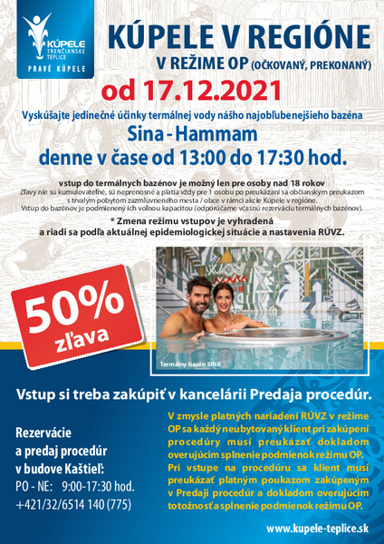 Zľavnené vstupné môžu využiť obyvatelia vybraných miest a obcí Trenčianskeho kraja zapojených do 9. ročníka projektu „Kúpele v regióne“ každý deň v čase od 13.00 h do 17.30 h. Zľava platí po preukázaní sa občianskym preukazom s trvalým pobytom v partnerskej obci či meste, ako aj dokladom overujúcim splnenie podmienok režimu OP. Vstup do bazéna je podmienený voľnou kapacitou a je potrebné zakúpiť si vstupenku v kancelárii Predaja procedúr. Viac informácií na www.kupele-teplice.sk.
