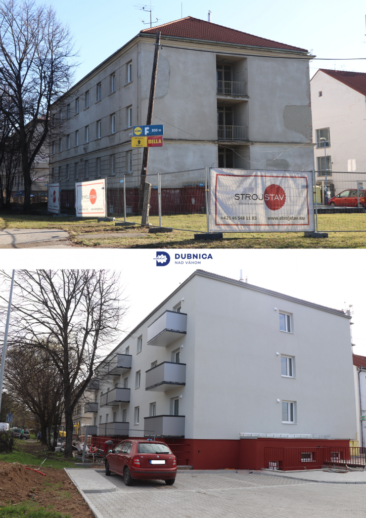 Nové nájomné byty mesto pripravilo na Ulici obrancov mieru v objekte č. 356, ktorý bol desaťročia sídlom Základnej umeleckej školy Dubnica nad Váhom. Novozrekonštruovaný trojpodlažný bytový dom pozostáva z 24 jedno- a dvojizbových bytov bežného štandardu, ktorých súčasťou je kúpeľňa s toaletou, kuchynský kút a nový balkón. Okrem toho má bytový dom k dispozícii aj pivničné a spoločenské priestory či parkovisko. „Veľmi ma teší, že prvé nájomné byty budú mať onedlho svojich nájomcov. Ide síce o prvú lastovičku, čo sa budovania nového nájomného bývania týka, naším zámerom je však naďalej vytvárať adekvátne podmienky pre mladé rodiny a obyvateľov, aby nám neodchádzali z Dubnice nad Váhom kvôli nedostupnému bývaniu do iných miest,“ priblížil primátor Peter Wolf.