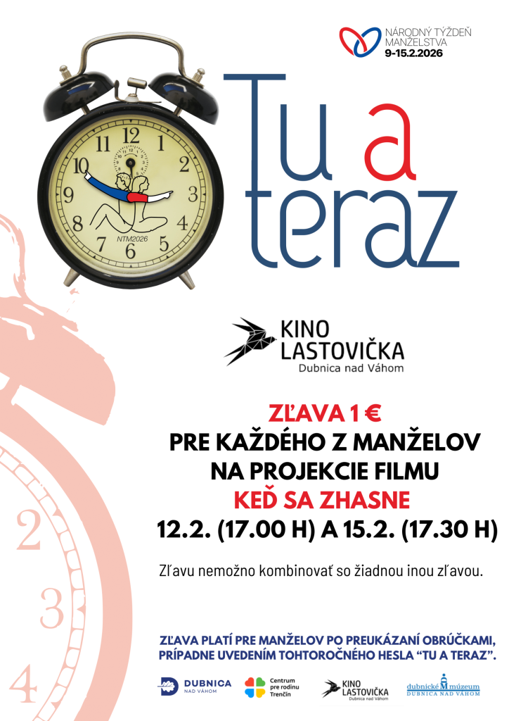 - Kino Lastovička – zľava 1 € pre každého z manželov na komédiu Keď sa zhasne (12.2.2026 o 17.00 h a 15.2.2026 o 17.30 h).