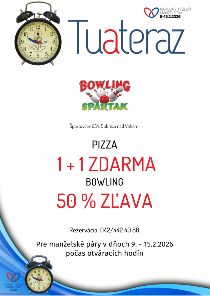 - Bowling Spartak – akcia na pizzu 1 + 1 ZADARMO alebo 50 % ZĽAVA na bowling.