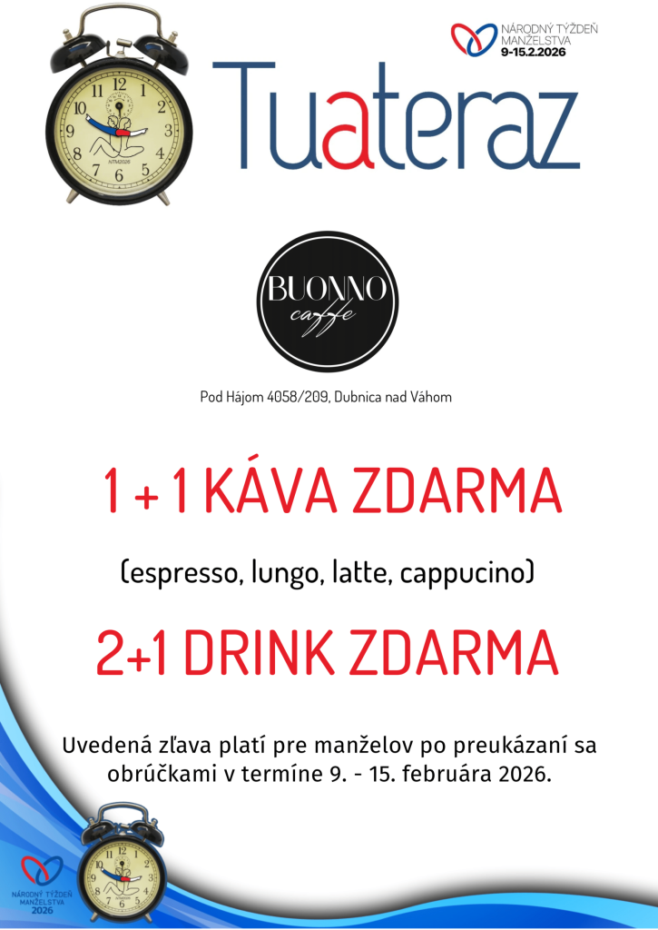 - Buonno caffe – akcia na kávu 1 + 1 káva ZADARMO alebo 2 + 1 drink ZADARMO.