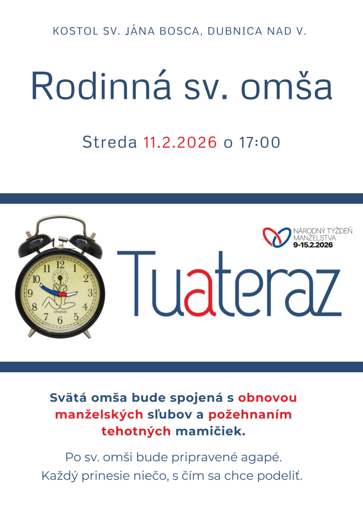 Pre veriacich manželov bude v rámci Národného týždňa manželstva odslúžená svätá omša v stredu 11. februára 2026 o 17.00 h v Kostole sv. Jána Bosca.