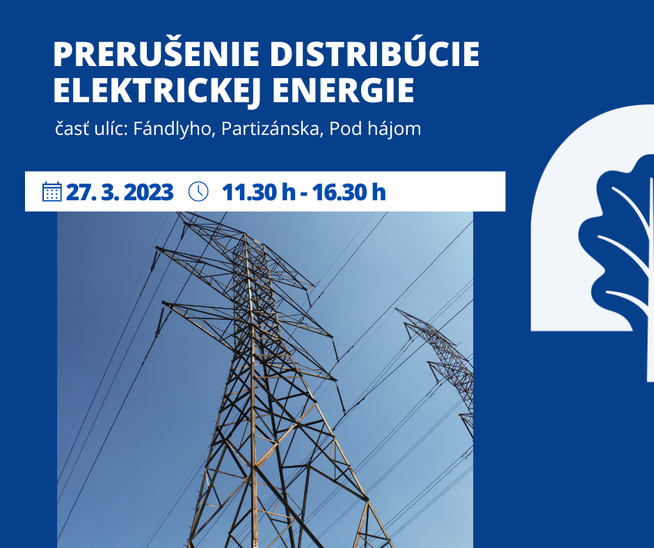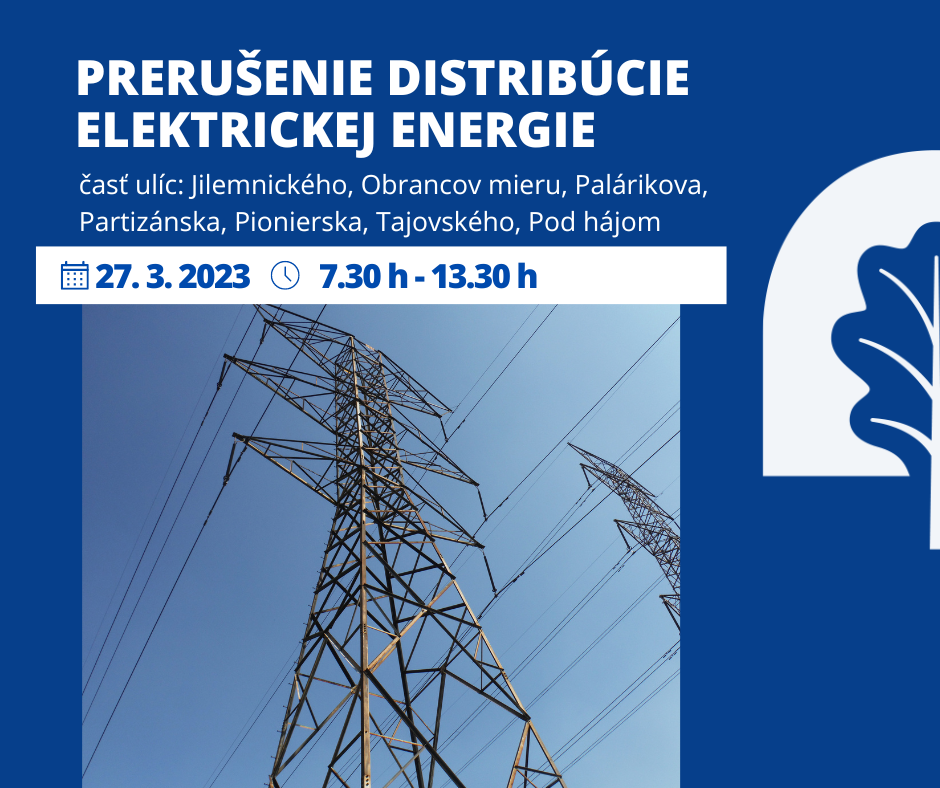 Prerušenie distribúcie elektrickej energie sa bude v čase od 7.30 h do 13.30 h týkať obyvateľov časti ulíc: Jilemnického, Obrancov mieru, Palárikova, Partizánska, Pionierska, Tajovského a Pod hájom.