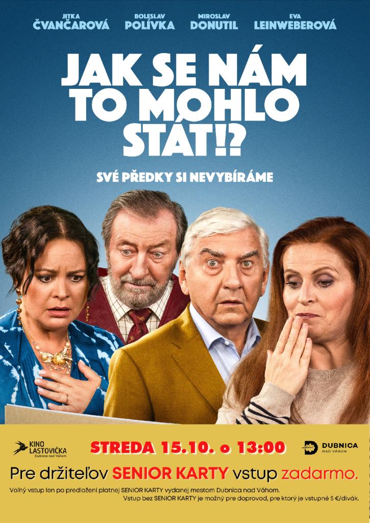 Najbližšie seniorov pozývame na projekciu českej komédie AKO SA NÁM TO MOHLO STAŤ?! v stredu 15. októbra 2025 o 13.00 h v Kine Lastovička.