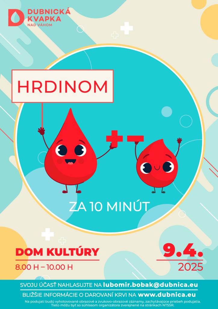 Úspešná tradícia s názvom Dubnická kvapka nad Váhom pokračuje aj v roku 2025, a to už v apríli. Mesto pozýva všetkých dobrovoľných darcov krvi v stredu 9. apríla do domu kultúry, kde si spoločne pustíme žilou v prospech tých, ktorí to najviac potrebujú. Aj tento výjazdový odber organizuje samospráva v spolupráci s Národnou transfúznou službou SR.