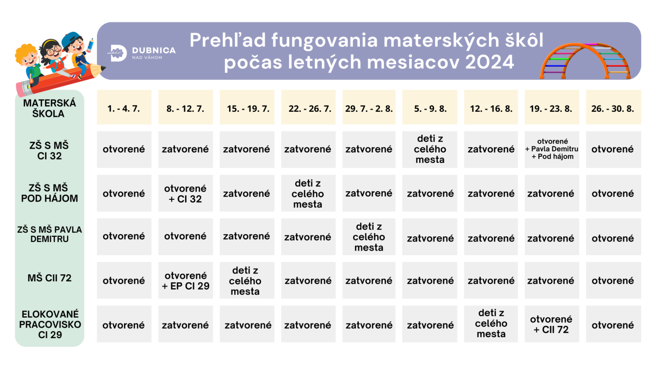Materské školy v zriaďovateľskej pôsobnosti mesta budú v letných mesiacoch v prevádzke od 8. júla 2024 do 23. augusta 2024 striedavo podľa dohodnutého harmonogramu. Náhradná materská škola bude počas letných prázdnin otvorená v prípade, že bude prihlásených najmenej 20 detí. „Ak klesne počet detí pod 10, prevádzka náhradnej materskej školy bude zrušená. Aj z tohto dôvodu žiadame rodičov, aby náhradnej materskej škole odovzdali riadne vyplnený a podpísaný informatívny súhlas spoločne s dokladom o zaplatení stravy, a to najneskôr do 21. júna 2024,“ informovala vedúca školského úradu Zdena Bunčáková.