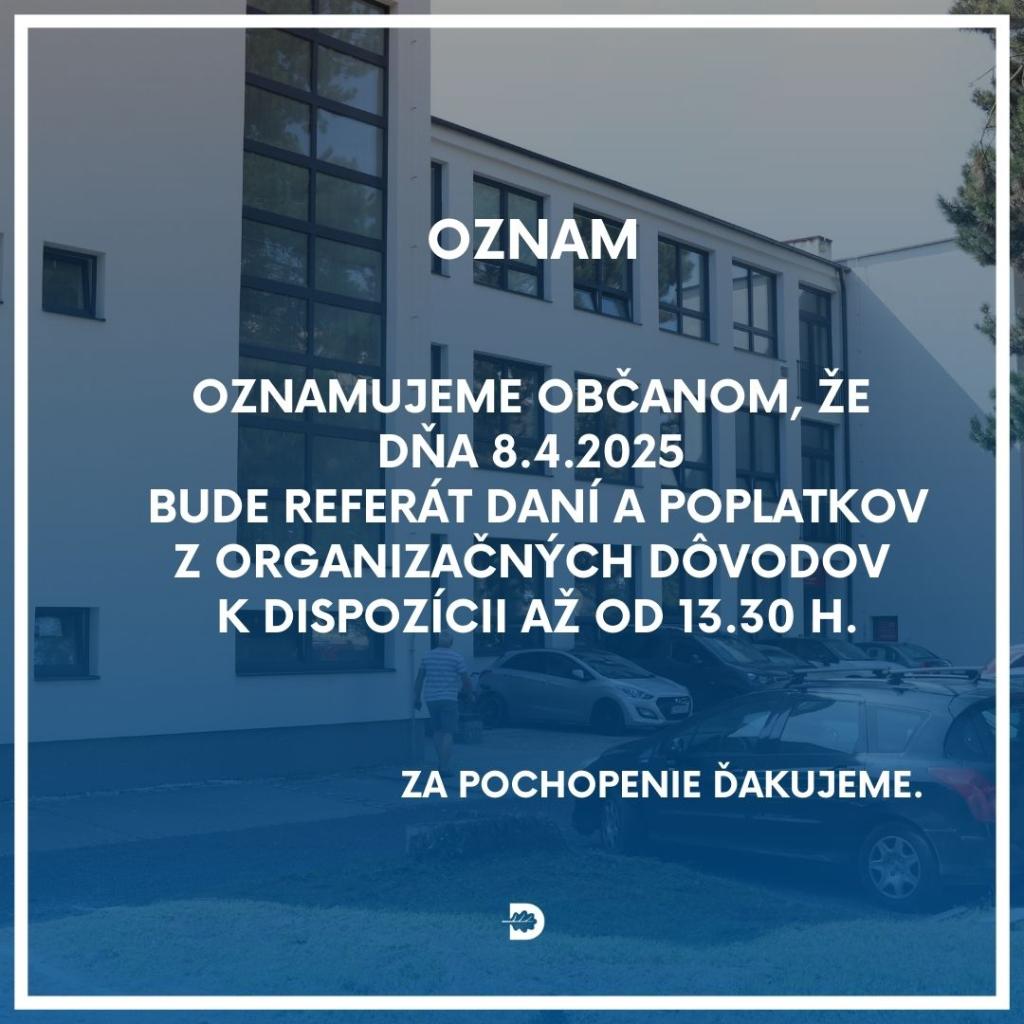 Oznamujeme občanom, že dňa 8.4.2025 bude referát daní a poplatkov z organizačných dôvodov k dispozícii až od 13.30 h.