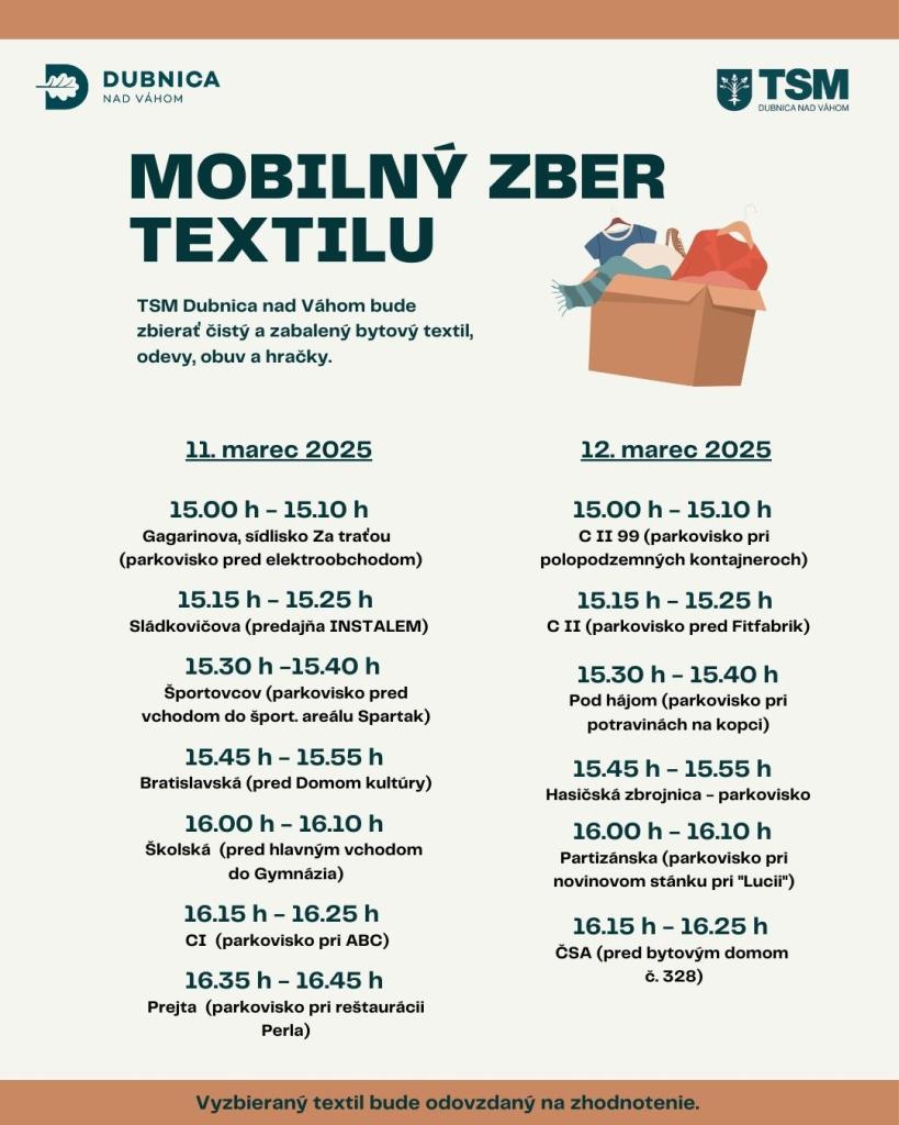 Ak aj váš šatník potrebuje vyprázdniť, o nepotrebný textil sa tiež postará mesto. Pracovníkom TSM môžete odovzdať nepoužívaný textil, odevy či hračky v rámci mobilného zberu textilu. Vyzbieraný textil bude odovzdaný na zhodnotenie. V prípade, že mobilný zber nestihnete, ale aj tak máte doma odevy či obuv, môžete ich kedykoľvek vhodiť do zberných nádob na textil, ktoré sú rozmiestnené po meste.
