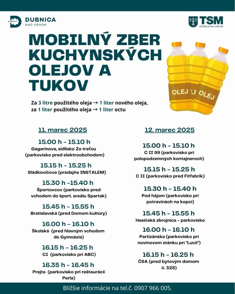Doneste aj vy použitý kuchynský olej a tuky v priehľadných nádobách a odneste si domov nový. Za každé 3 litre použitého kuchynského oleja dostanete 1 liter nového oleja, prípadne môžete vymeniť 1 liter použitého kuchynského oleja za 1 liter octu.