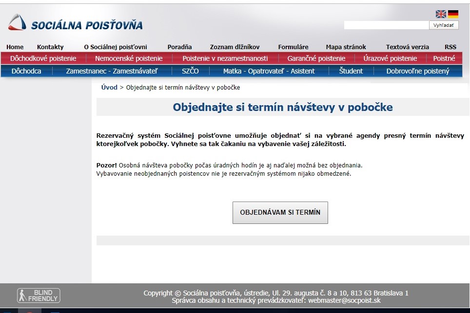 Rezervačný systém Sociálnej poisťovne je bezplatný a pre prístup netreba žiadne heslo. Stačí si otvoriť webovú stránku www.socpoist.sk a kliknúť na Objednajte si termín návštevy v pobočke. Potvrdenie s termínom a menom zamestnanca, ktorý návštevu občana vybaví, obratom príde na zadanú e-mailovú adresu. Objednať sa je možné a priamo na pobočke poisťovne prostredníctvom počítača v kiosku alebo telefonicky cez Informačno-poradenské centrum na bezplatnej linke pre dôchodky 0800 123 123.