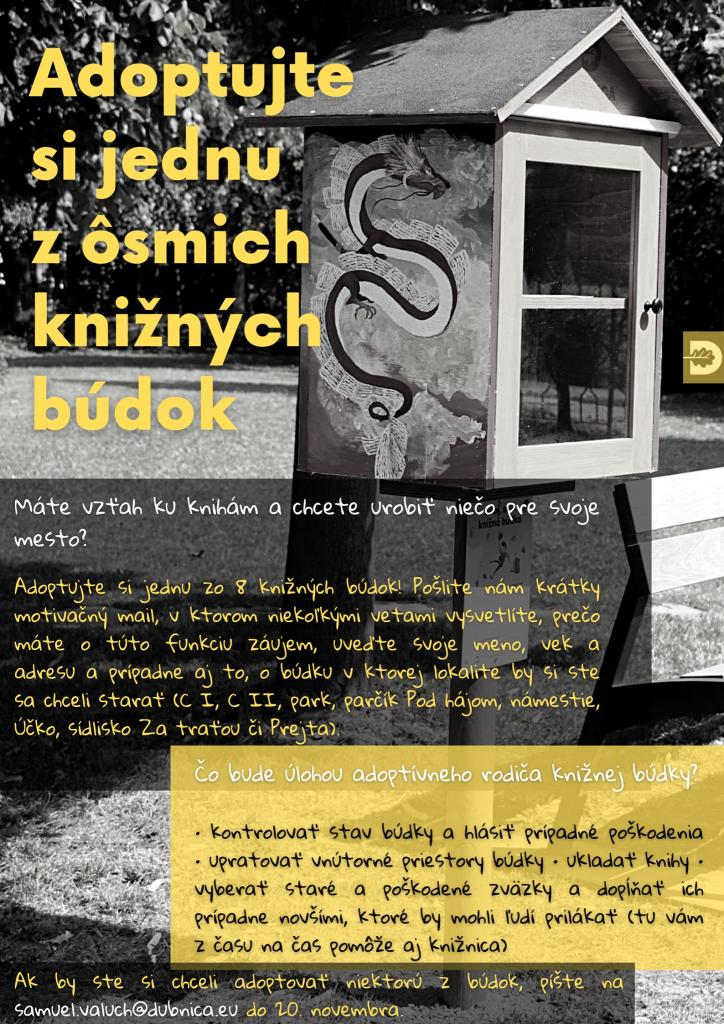 Knižnica však plní funkciu opatrovateľa búdok len dočasne. Ako sme avizovali už na slávnostnom otvorení na Babylone, radi by sme našli ľudí, ktoré si búdky „adoptujú“. „Každú jednu z nich teda bude mať na starosti človek, ktorý pravidelne skontroluje jej stav, nahlási prípadné poškodenia, uprace knihy, odstráni staré „ležiaky“ a prípadne doplní nové, ktoré môže z času na čas zabezpečiť napríklad aj mestská knižnica,“ hovorí Beáta Nemcová.