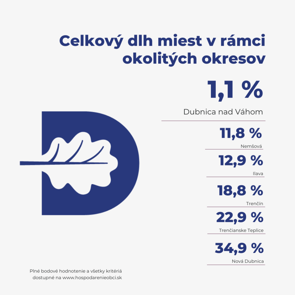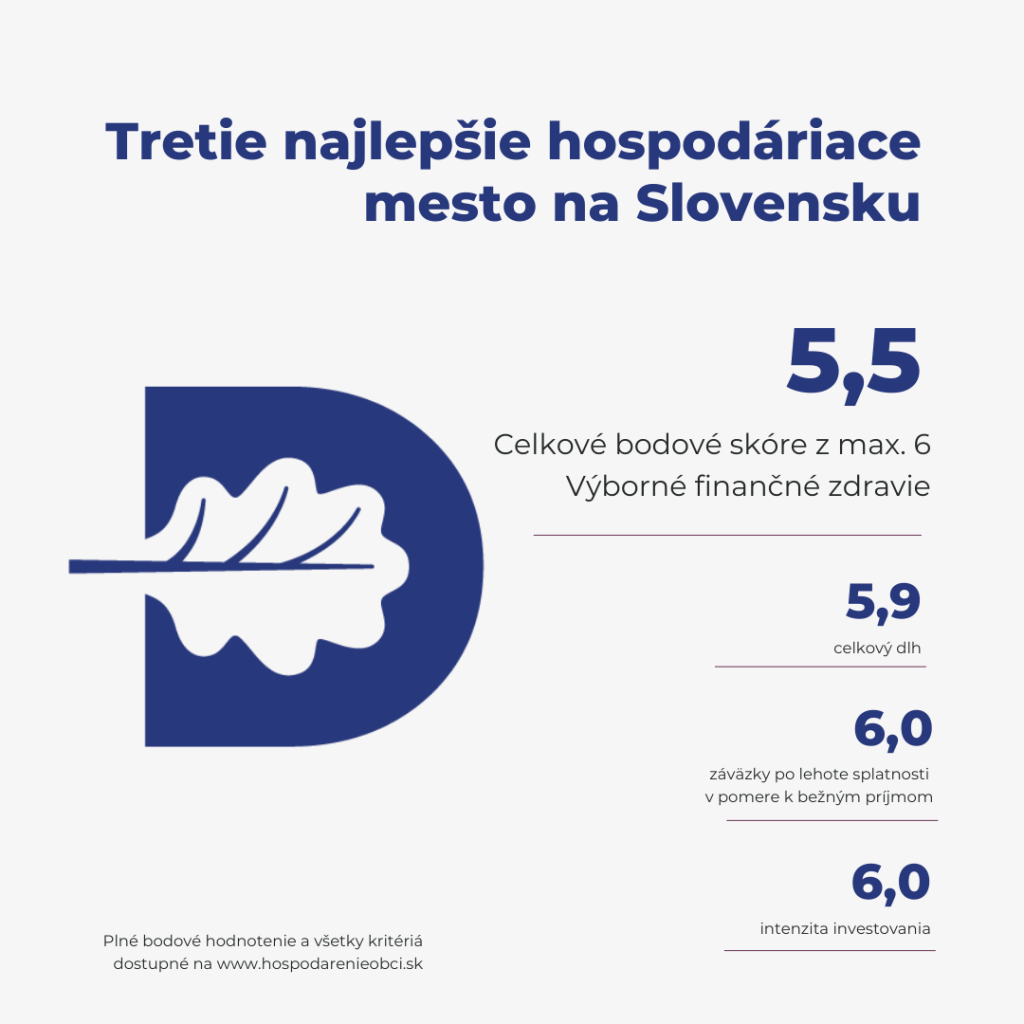 Rebríček, ktorý hodnotí finančné zdravie, ale aj hospodárenie slovenských miest, obcí a vyšších územných celkov každoročne zostavuje nezávislý Inštitút pre ekonomické a sociálne reformy (INEKO). Zameriava sa pritom na viacero faktorov, medzi ktorými nájdete celkový dlh samosprávy, splatnosť jej záväzkov či intenzitu investovania. Priemerná hodnota celkového dlhu je v rámci slovenských miest 23,1 %, Dubnica nad Váhom patrí v tejto štatistike s hodnotou 1,1 % k celoslovenským lídrom. Plným počtom bodov ohodnotil INEKO stav záväzkov mesta a intenzitu investícií, čo svedčí o nadpriemernej kondícii mesta a jeho procesov. Dubnica nad Váhom je teda už druhým rokom po sebe tretím najlepšie hospodáriacim mestom na Slovensku s bodovou hodnotou 5,5. „Rok 2023 priniesol stabilizáciu hospodárenia samospráv. Priemerné skóre finančného zdravia za všetkých 141 miest na Slovensku dosiahlo hodnotu 4,22 z maximálnych 6,00. Mestá boli na vrchole svojho finančného zdravia počas rokov 2017 až 2020,“ informuje Dušan Zachar, riaditeľ INEKO. Skóre nad 5 bodov s hodnotením „výborné finančné zdravie“ dosiahlo podľa INEKO len 38 miest. „Teší ma, že sa nám podarilo dosiahnuť takýto vynikajúci výsledok aj v ťažkej ekonomickej situácii, s ktorou aktuálne samosprávy bojujú. Aj napriek tomu mesto pokračuje v investíciách do rozvojových projektov a infraštruktúry, čo považujem za kľúčové pre napredovanie samosprávy a zvýšenie kvality života v meste,“ uviedol primátor Peter Wolf.