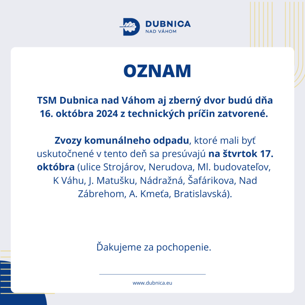Zvozy komunálneho odpadu, ktoré mali byť uskutočnené v tento deň sa presúvajú na štvrtok 17. októbra (ulice Strojárov, Nerudova, Ml. budovateľov,