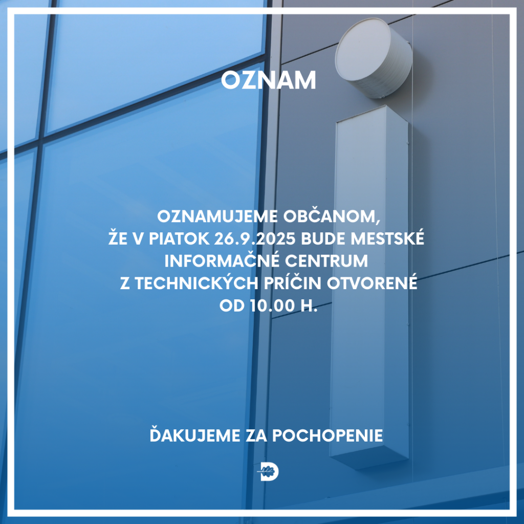 Upozorňujeme, že dňa 26.9.2025 bude Mestské informačné centrum na Námestí Matice slovenskej otvorené až od 10.00 h. Za pochopenie ďakujeme.