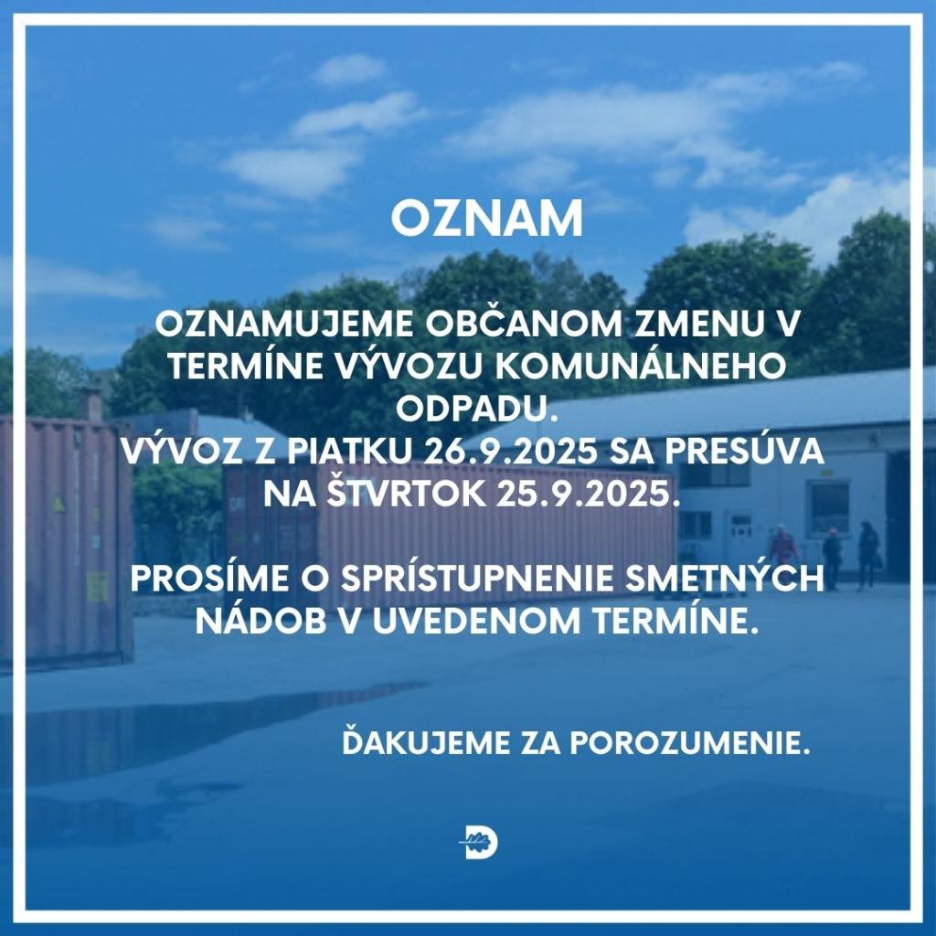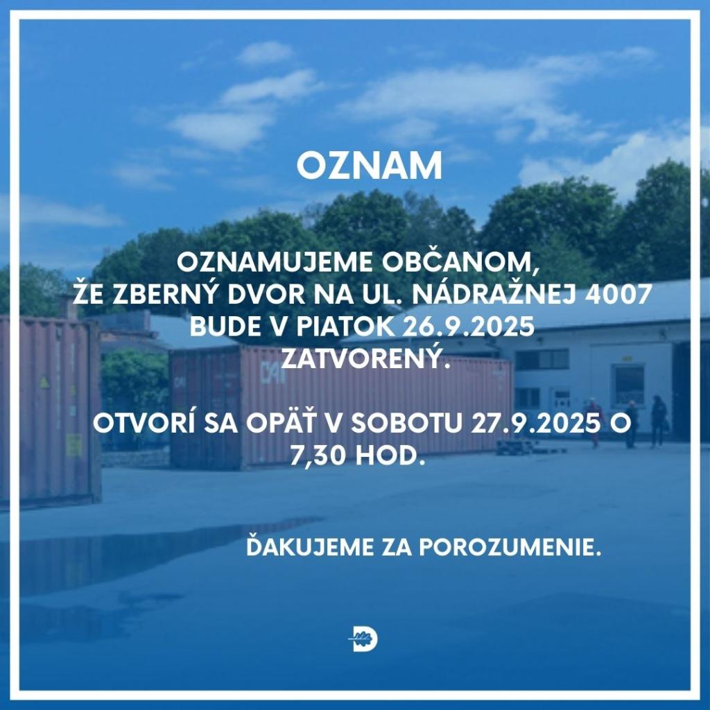 Zároveň informujeme občanov, že v piatok 26. 9. 2025 bude zatvorený zberný dvor na ul. Nádražnej 4007. K dispozícii občanom bude opäť v sobotu 27. 9. 2025 v riadnych otváracích hodinách.