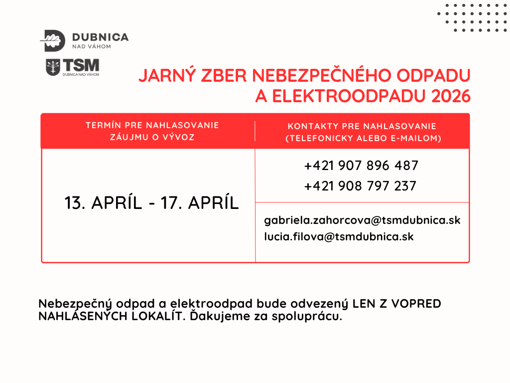 Zber sa uskutoční v mesiaci apríl v štyroch termínoch. Pripomíname však, že elektroodpad a nebezpečný odpad bude odvezený len od tých občanov, ktorí žiadosť o odvoz nahlásia vopred – a to v termíne od 13. - 17. apríla 2026 telefonicky +421 907 896 487 alebo +421 908 797 237, prípadne e-mailom na gabriela.zahorcova@tsmdubnica.sk alebo lucia.filova@tsmdubnica.sk.