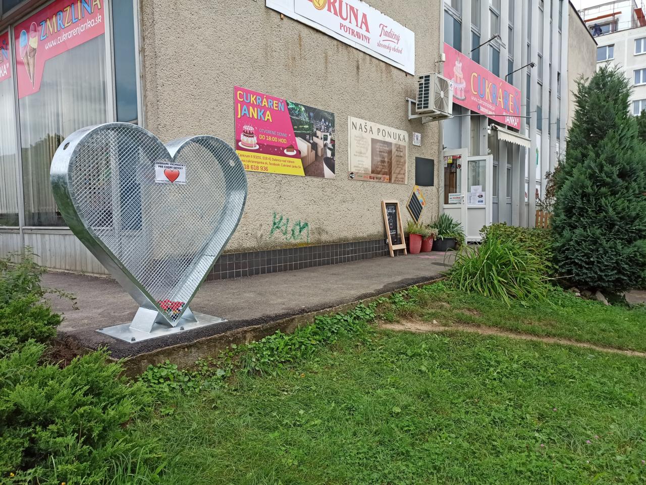 Za myšlienkou osadenia charitatívneho srdca stojí majiteľka cukrárne Jana Nitschneiderová: „Nedávno som našla na internete, že takéto obrovské srdcia majú v Maďarsku. Začala som teda pátrať, či niečo také funguje aj u nás. Skontaktovala som sa s výrobcami a srdiečko už má pri našej cukrárni svoje čestné miesto od začiatku septembra.“