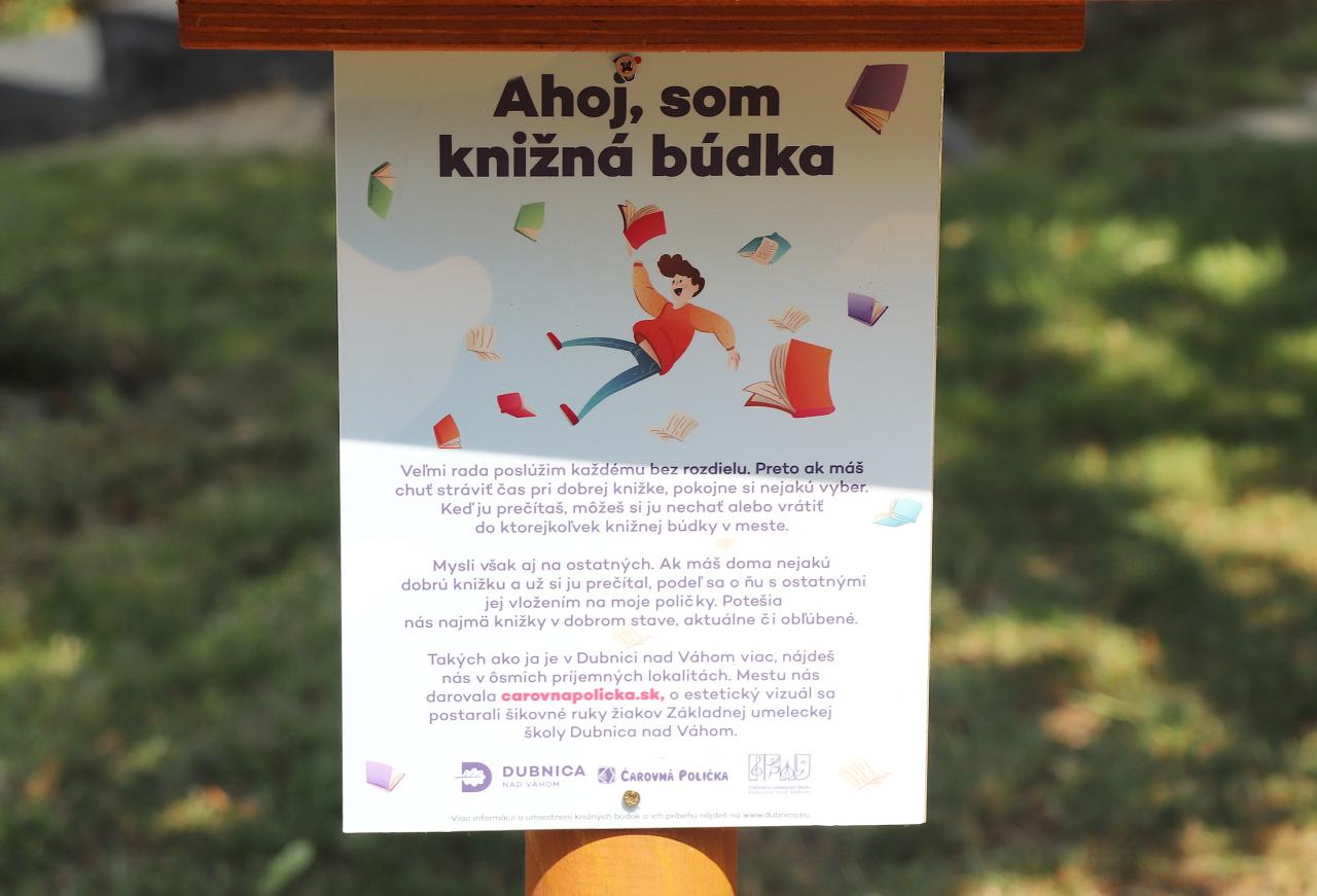 Knihobúdky dalo vyrobiť mesto Dubnica nad Váhom vďaka sponzorskému daru od carovnapolicka.sk. Za ich pomaľovanie ďakujeme Základnej umeleckej škole v Dubnici nad Váhom a za ich osadenie technickým službám mesta.