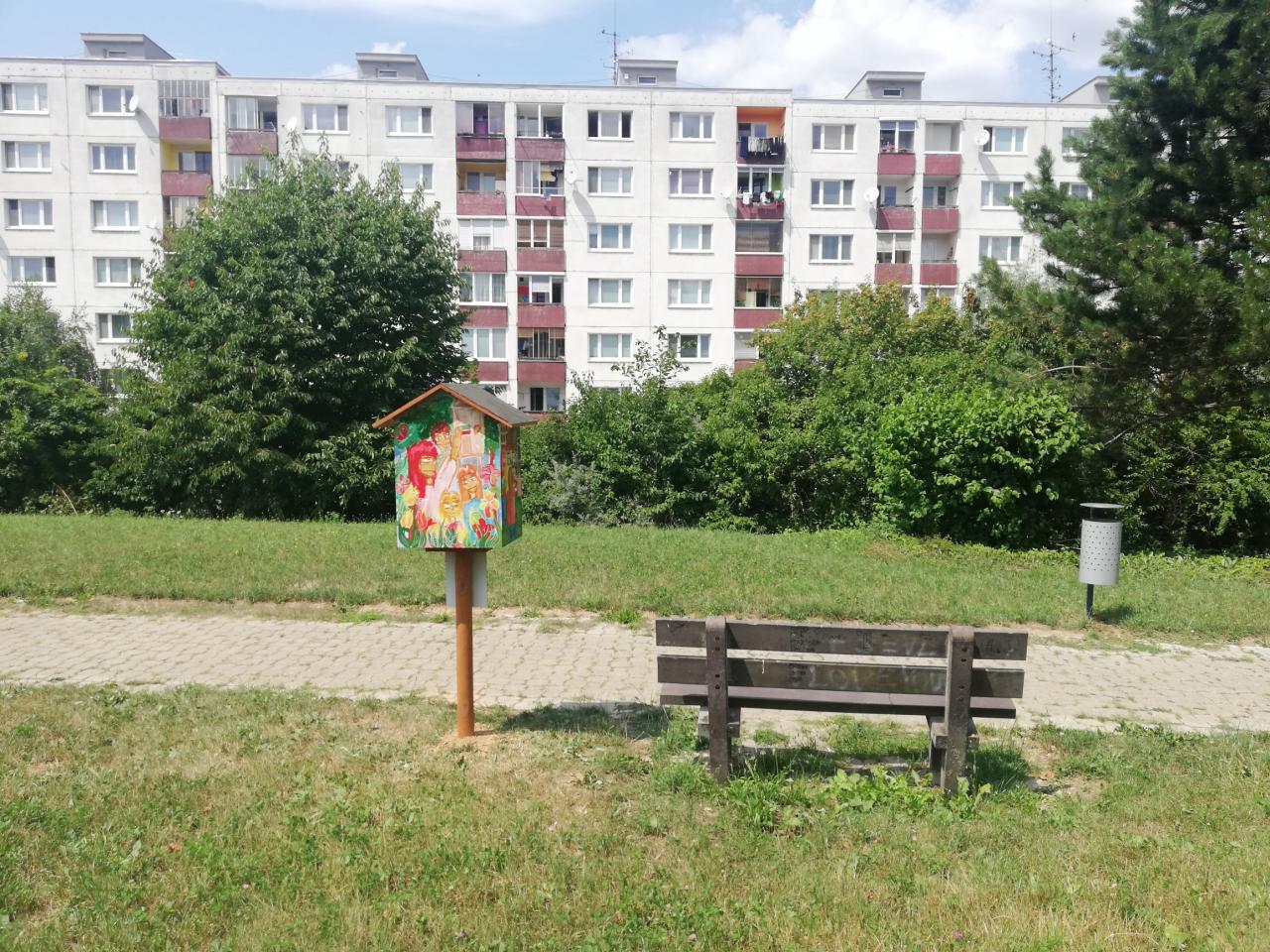 Ostala mu posledná búdka. Pán P. však dobre vie, kam má ísť. Na sídlisku Za traťou už vďaka aktívnym ľuďom búdku dávno majú, a tak môže pokojne nasadnúť do autobusu. V tichom šume motora míňa Rozptyl aj Dukelskú štvrť a na tretej zastávke vystúpi. Kráča chvíľu hore ulicou, potom zastane a rozhodne sa: Sem dám tú siedmu. Prejťania to majú do knižnice najďalej, snáď ich poteší aspoň knižná búdka. A do mapy urobí siedmy a posledný krížik.