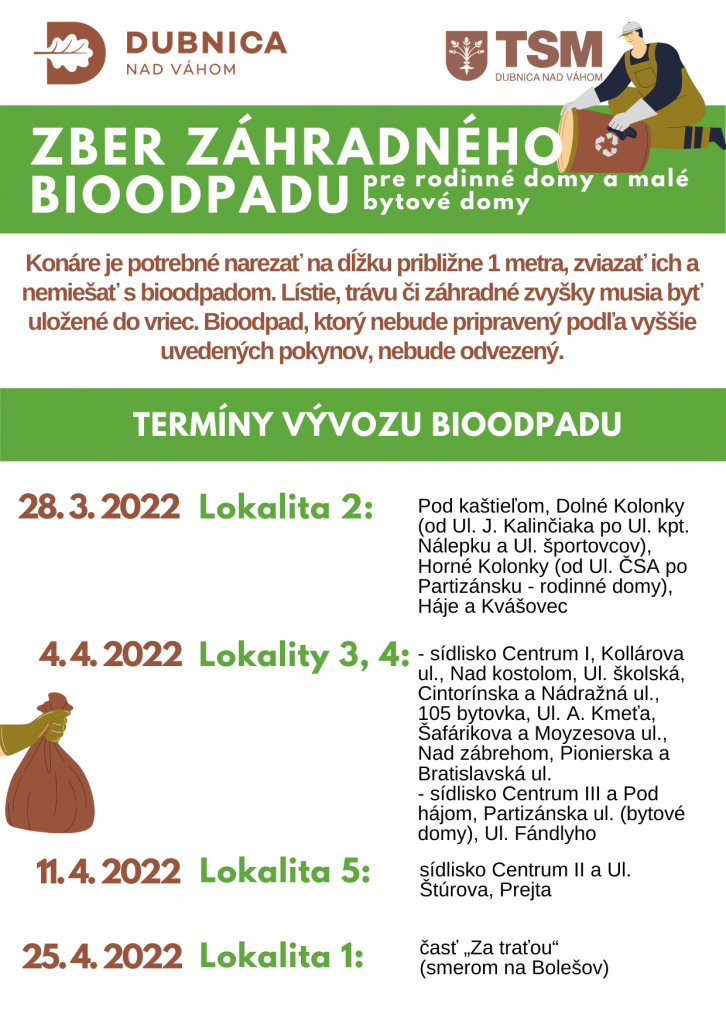 Záhradný bioodpad (lístie, trávu alebo záhradné zvyšky) uložený do vriec môžu obyvatelia rodinných domov a malých bytových domov vykladať v predvečer termínu zberu, najneskôr však v skorých ranných hodinách v deň zberu v ich lokalite. Konáre je potrebné narezať na dĺžku približne 1 meter, zviazať ich a nemiešať s bioodpadom.