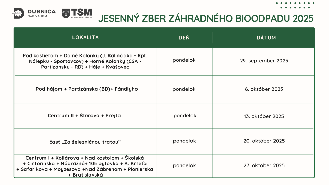 Odvoz bioodpadu je naplánovaný na presne určené termíny podľa konkrétnych lokalít: