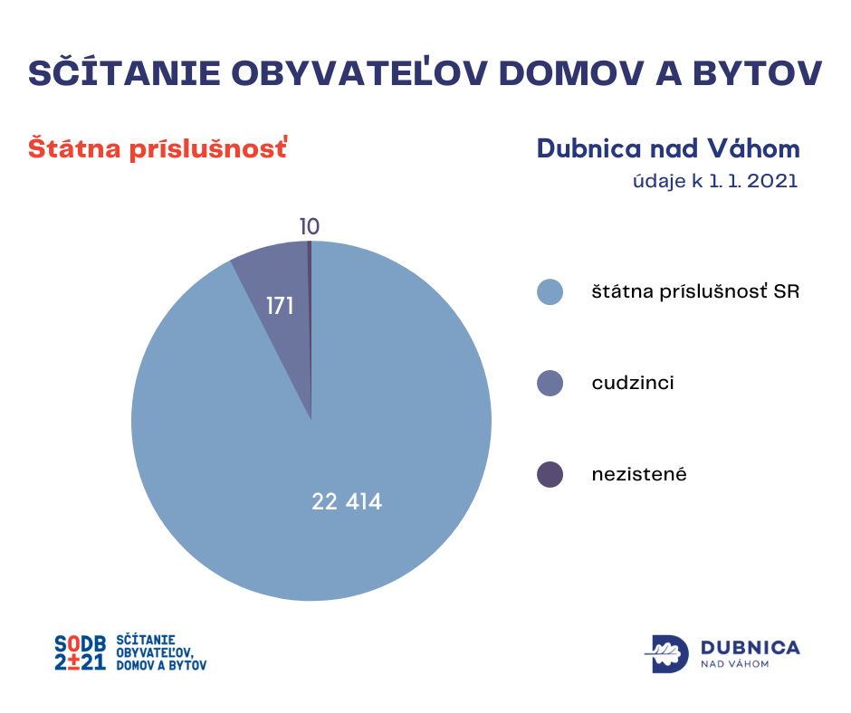 Údaje o štruktúre obyvateľov v Dubnici nad Váhom podľa národnosti jasne hovoria o prevládajúcej slovenskej národnosti (20 910).