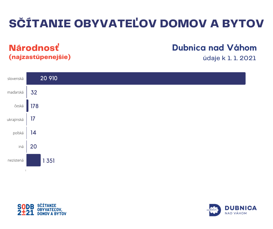 Údaje o štruktúre obyvateľov v Dubnici nad Váhom podľa národnosti jasne hovoria o prevládajúcej slovenskej národnosti (20 910).