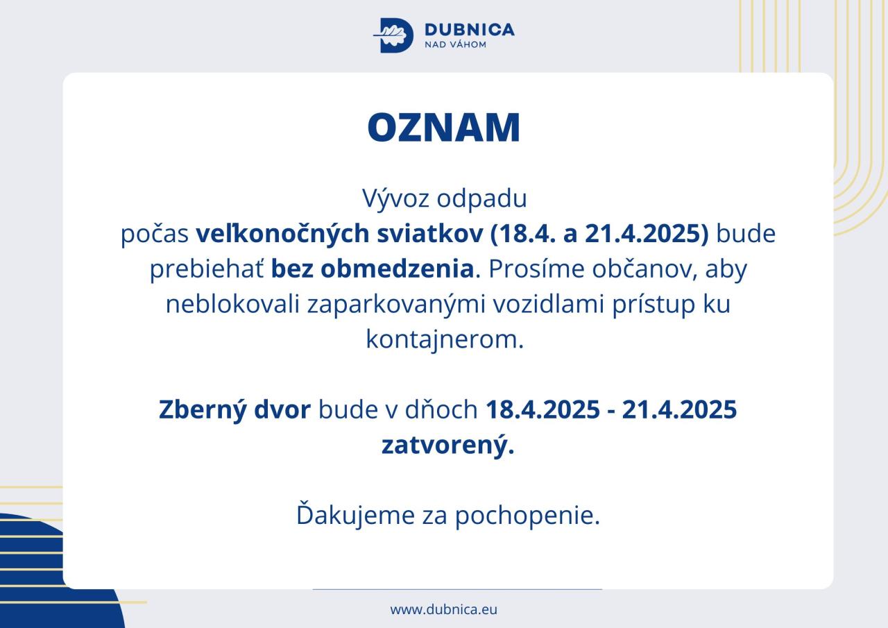 Zberný dvor bude 18.4.2025 - 21.4.2025 zatvorený.