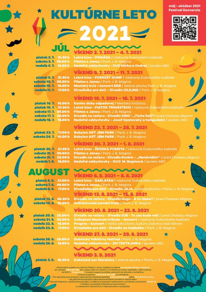 Kultúrne leto 2021 v Dubnici nad Váhom je jedným veľkým festivalom pozostávajúcim z menších festivalov, nedeľných koncertov v centre mesta, detských divadielok na zelenej tráve, filmov pod hviezdnym nebom, divadlom pri západe slnka a veľkým stretnutím s umením a kultúrou s dobrými priateľmi. Srdečne všetkých pozývame!