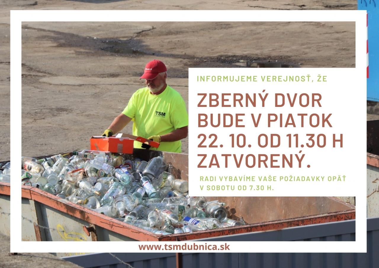 V piatok 22. októbra 2021 bude od 11.30 h z technických príčin zatvorený zberný dvor na Nádražnej ulici. Verejnosti bude opäť k dispozícii v sobotu 23. októbra 2021 od 7.30 h. Ďakujeme za porozumenie.