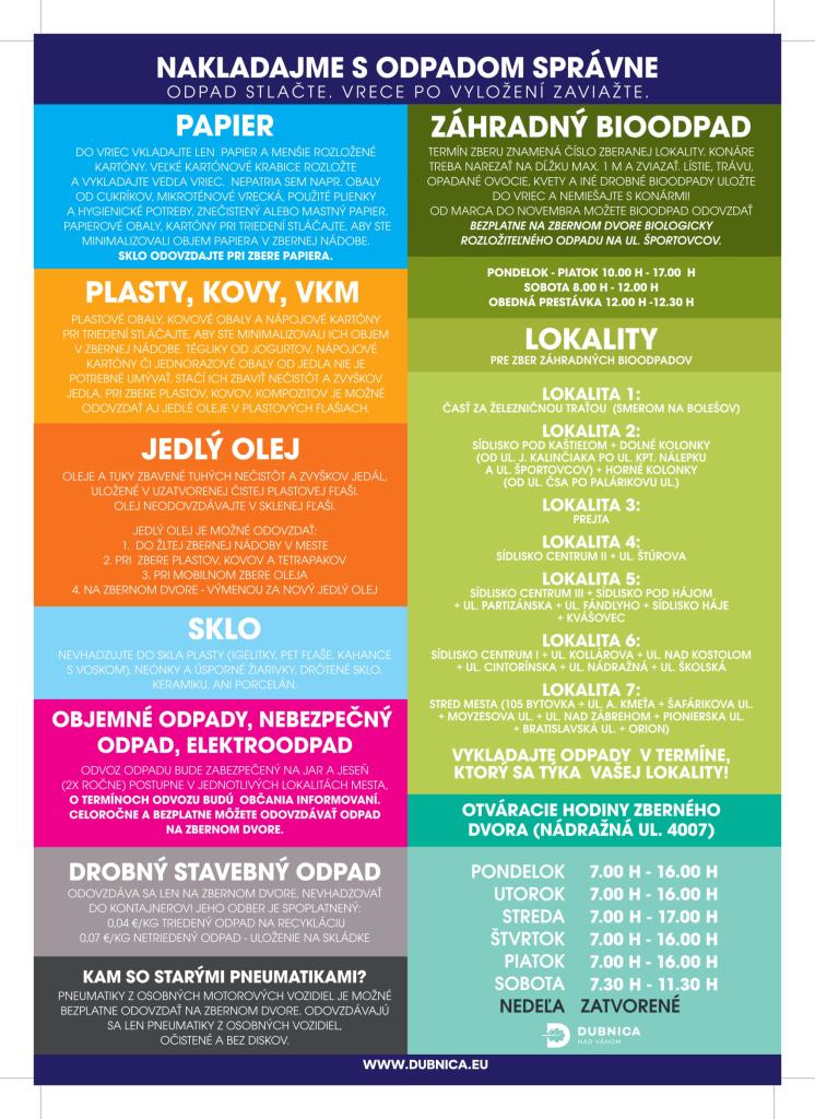 - Od 1. januára 2026 sa zavedie na celom území mesta Dubnica nad Váhom spoločný zber triedených zložiek komunálneho odpadu a to plastov, kovov a tetrapakových obalov. Z praktického hľadiska to znamená, že ak je naplnená nádoba na plast, tak svoj plastový aj kovový odpad môžete vyhodiť aj do červenej nádoby a opačne. Obyvatelia rodinných domov budú môcť všetky tri druhy tohto odpadu vhadzovať do žltých vriec.